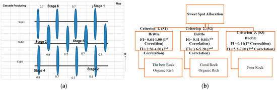 As Soliman et al. [12,15,16] indicated, the fracturing of horizontal wells is superior to vertical wells under the following conditions: (1) vertical restricted flows and nonideal formation productivity because of low permeability or shale streaks; (2) directions of natural fractures varying from that of stimulated fractures; (3) poor stress contrast between the pay zone and surrounding barriers. Based on the azimuth between the wellbore and horizontal stress, transverse and longitudinal are the two primary fracture directions, and the most preferred fracturing azimuth of the horizontal well is perpendicular to the minimum horizontal stress with multistage fracture planes intersecting along most laterals with a maximizing contact surface flow area and stimulated reservoir volume (SRV) (Figure 2a). Operators aim to maximize the fluid and proppant volume delivered within a relatively short time. Multiple clusters of stages are perforated and stimulated sequentially as the typical horizontal well completion. Reorientation will happen if the fractures deviate with horizontal stresses, and careless operational calculations would cause seriously rough sand faces, especially in transverse fractures [12,15]. Several critical questions, as Soliman and Grieser [16] mentioned, about multistage transverse fracturing wells are the optimum spacing, the well orientation with horizontal wells, the open area between fractures, and the best well fracturing timing. The optimum spacing is dependent on the fluid flow, stress interference, and economic costs. As Figure 3a shows, the simulated cumulative production increasing rate will decrease when the transverse fracture number increases, and after a certain number, increasing the number of fractures is not profitable anymore. Shelley and Soliman [17] simulated the effect of fracturing time for a gas–condensate reservoir where condensate banks can hinder fluid flow. A later fracturing time causes the formation of a larger condensate bank, which would cause a significant delay in gas production and lead to more uncoverable condensate (Figure 3b).