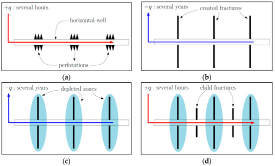 Several authors have developed methods to manipulate the fracturing sequence to enhance the fracture complexity and the stimulated reservoir volume to improve hydraulic fracturing performance. In order to induce and enhance the fracture complexity in brittle far-field shale reservoirs, Soliman et al. [31,32] put forward two alternative completion options, especially for coiled tubing completed horizontal wells from 2010. The first approach, shown in Figure 8a, is named “Commuter Frac” (Stress-Diversion Method), with the novelty of integrating alternative pumping schedules with real-time net pressure and microseismic fracturing mapping (MSFM) for decision-making improvement. Targeting at exceeding the abrasive fluid pumping rate limit and alternative treatment fluid properties, this new method is aided with a high-rate nonabrasive fluid injection in the annulus to deliver the proppant in the coiled tubing (CT) to form branch fracturing deep in reservoirs with proppant bridging and pack at perforations by decreasing the pumping rate of slickwater. Overflush can be achieved by simply ceasing pumping in the CT. The second alternative method was termed as “Texas Two-Step”, which is a three-interval treatment from toe to heel with limited-entry perforations (Figure 8b). The stress field is altered between two main bi-wing fractures with natural fractures opened by higher net pressure, and then the third fracture is cracked with an inhibited length to connect parallel induced stress-relief fractures with bi-wing fractures. This alternative technique can be fulfilled by the mechanical shifting of sleeves (MSS) using coiled tubing or jointed pipe, which is compatible with the Commuter Frac method and enhances its performance enormously. As the authors demonstrated in the paper, the Commuter Frac method has been applied in Eagle Ford Shale in South Texas to solve the issues of Perf and Plug for a more aggressive and tailorable treatment schedule.