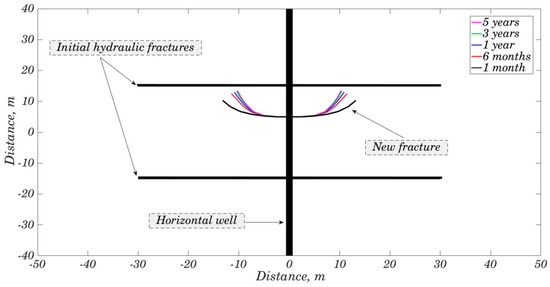 Simultaneous and sequential hydraulic fracturing are popular and widely accepted by the industry with a fracture complexity design for broader fracture contacts. The propagation of fractures depends on the opposite fracture-tip stress perturbation to force the fractures to propagate perpendicular to the horizontal wells. To imitate the induced stress of the “Texas Two-Step” method, Rafiee et al. [33] proposed a new simplified alternative design named “Modified Zipper Frac” (MZF) (Figure 9) for the multistage laterals to further optimize the zipper frac with a staggered pattern and no downhole operations by changing the stress perturbation field with the middle fracture for every two consecutive fractures. After studying the stress interference of penny-shaped, semi-infinite, and elliptical fractures, they concluded that the minimum horizontal stress change is highest and serves as an indicator for stress anisotropy and fracture complexity variations, and its change becomes negligible for a length–height ratio larger than 5. As Figure 10 shows, the Modified Zipper Frac method can enhance production performance by increasing the far-field fracture network complexity.