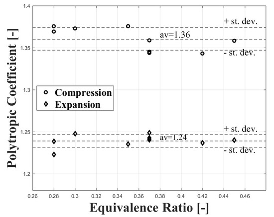 The compression polytropic coefficient was calculated between 90 and 80 CAD bTDC, while the expansion polytropic coefficient was calculated between 60 and 90 CAD aTDC. Figure 2 shows the values obtained for both coefficients at different equivalence ratios. It can be observed that the polytropic coefficients show few variations with the equivalence ratio. For this reason, the compression, and expansion polytropic coefficients were assumed as constants.