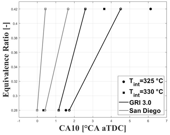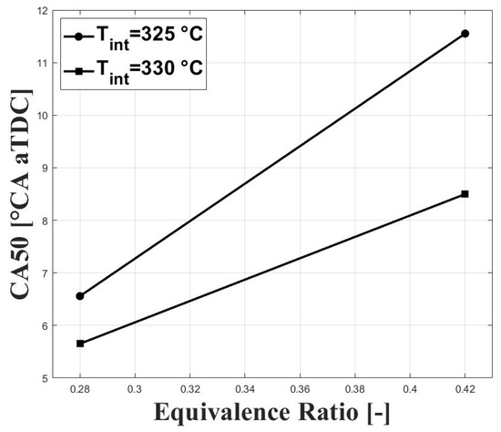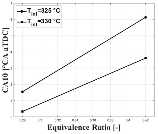 Figure 3 and Figure 4 show the respective CA10 and CA50 related to the evaluated equivalence ratios and intake charge temperatures required for stable combustion. An intake temperature of 325 C was necessary to allow for HCCI combustion at the tested conditions, and previous research performed by Bedoya et al. [7] showed that intake temperatures around 200 C allowed for stable HCCI combustion at sea level and with boosted inlet pressures close to 2 bar. For the same intake temperature, it can be seen that both CA10 and CA50 were delayed when the equivalence ratio was increased. This trend is associated with a higher concentration of CO in the intake mixture with higher equivalence ratios. However, the delayed combustion effect was reduced at higher intake temperature due to the higher in-cylinder temperature.