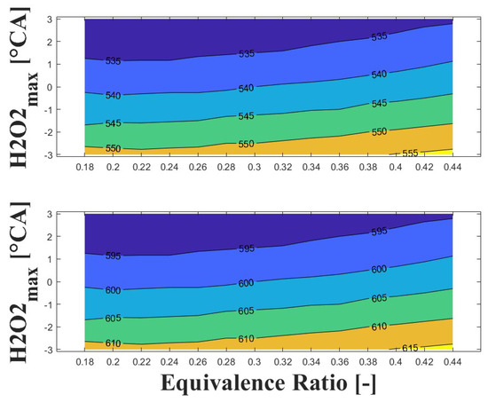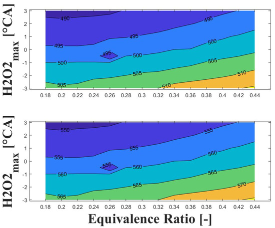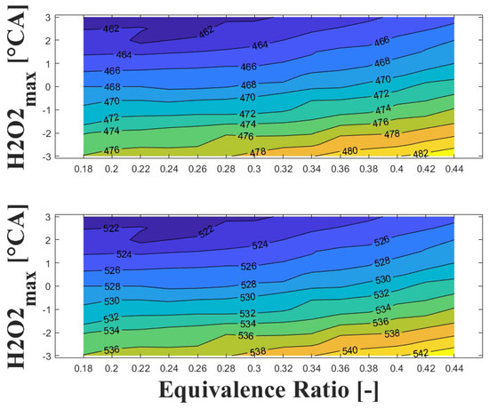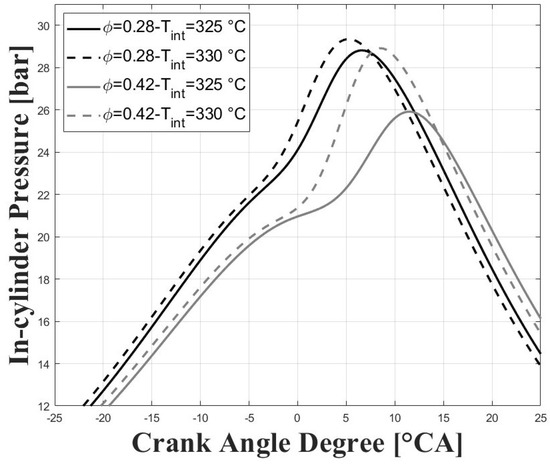 Figure 14, Figure 15 and Figure 16 show the effect of increasing the intake pressure on the intake temperature required to reach safe operating conditions. It can be observed that is possible to reduce the intake temperature by up to 25 C for the same equivalence ratio and ignition timing when the intake pressure is increased around to times. This effect has been reported in previous papers [24,25,26].