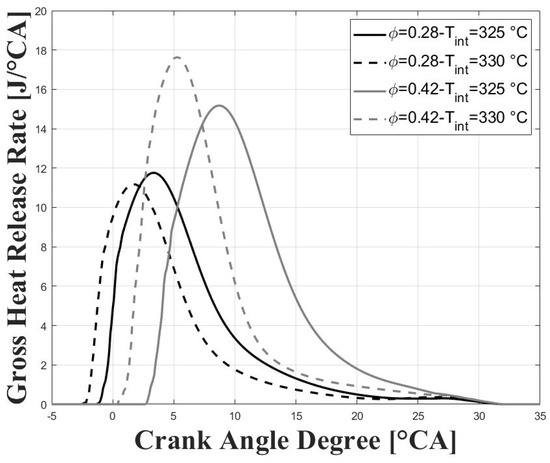 Figure 5 and Figure 6 show the respective in-cylinder pressure and gross heat release rates at the different intake temperatures and equivalence ratios evaluated. As expected, the pressure peak was increased, and was closer to TDC for higher intake temperatures, and this trend was more obvious for the higher tested equivalence ratios. Similar trends were observed for the peaks of the gross heat release rates. The maximum pressure reached for the conditions evaluated in this research were well below the maximum pressure reached in previous research for similar compression ratios [7,8,9] due to the lower intake pressure and for the higher required intake temperatures, which together lead to greatly reduced power output.