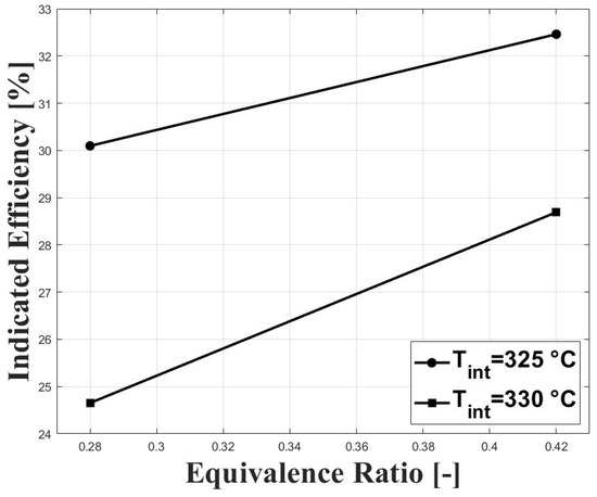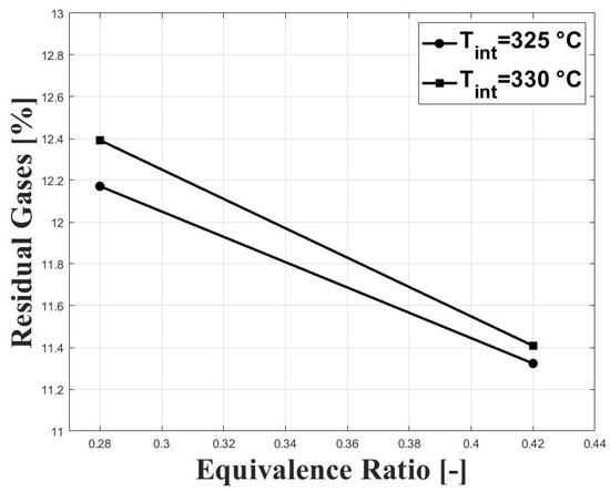 Figure 7 shows the normalized standard deviation of IMEPg and Figure 8 shows the percentage of residual gases, with both figures related by the equivalence ratio. When the equivalence ratio was increased, combustion was delayed due to higher concentration of CO in the charge (see Figure 3 and Figure 4). However, cycle-to-cycle variations were significantly reduced, as can be seen in Figure 7. It can be observed that at an equivalence ratio of the engine operated with higher combustion instability, especially at the intake temperature of 325 C. This trend is explained by the higher percentage of residual gases presented at lower equivalence ratios, as can be seen in Figure 8. Higher charge dilution leads to increased cyclic variability for heat release rates and in-cylinder pressure traces [9]. In Figure 8, it can be observed that the estimated residual gases inside the cylinder from the previous cycle are greater that the expected values for compression ignition engines [14], which is explained by the high crank angle interval at which the intake and exhaust valves remain open in the exhaust and intake strokes (see IVC and EVO in Table 1). The greater values of residual gases for the equivalence ratio of compared with the ratio of explain the lowered pressure peak when the intake temperature increases (see Figure 5).