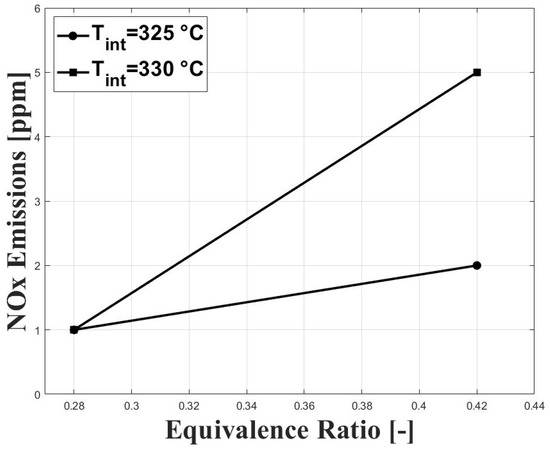 Figure 11 shows the NOx emissions in relation to the evaluated conditions. As expected, NOx emissions were increased with higher equivalence ratios; however, the concentrations remained ultra-low, which is a feature of HCCI combustion. Similar results on NOx emissions were reported in previous research by Bedoya et al. [7].