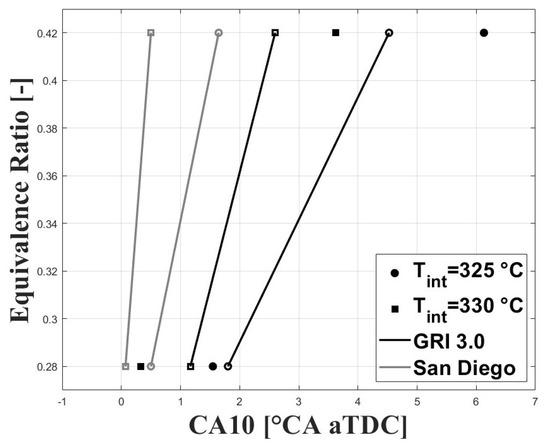 As mentioned above, the combustion timing was defined as the crank angle for the peak molar fraction of HO. The experimental IVC conditions were used to run simulations under the single-zone approach. The charge composition was defined according to the estimated experimental equivalence ratios and residual gas fractions (RGF). Figure 12 and Figure 13 show the simulated and experimental ignition timings. The results are shown for the GRI and San Diego mechanisms (both the original mechanism and the version including the ozone kinetics submechanism from Halter et al. [22]). In Figure 12, it can be seen that the GRI mechanism shows better agreement with experimental data for the condition when combustion is delayed. However, when combustion is highly delayed the model predicts ignition timings closer to TDC. This could be associated with the effects of turbulence and charge stratification for ignition timings greater than 2 CAD aTDC, which are not completely accounted for in the simplified single-zone model. On the other hand, the two San Diego mechanisms show lower agreement with the experimental data for delayed conditions, and better agreement for ignition timings near the TDC compared to GRI . In Figure 13, it can be observed that inclusion of the ozone submechanism has a slight effect on the simulated results, showing slight combustion advancement. Thus, it can be assumed that any effect on combustion advancement when ozone is added to the charge and the ozone submechanism is used is strictly related to the kinetic effect of this species.