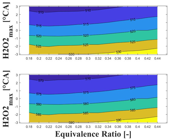 The important information conveyed by Figure 14, Figure 15 and Figure 16 is the temperature required for safe operation, which is shown in the bottom graph of each figure. This temperature was always observed to be 50 and 60 C higher than the temperature calculated during the experiments at the IVC. The figures show that the lowest temperature requirements are associated with medium-lean equivalence ratios and delayed ignition timings, while high-lean and advanced ignition timings require the highest temperatures. In the case of the engine used in the research, high temperatures above 290 C were required to achieve a safe operating condition in the zone of delayed ignition timing, which could adversely affect engine efficiency and lead to derating compared to diesel operation, this being a drawback of using HCCI combustion in microgeneration with biogas or other biofuels with high resistance to auto-ignition. Additionally, these high temperatures could impact the lubrication system due to heating of the in-cylinder surfaces during the intake stroke, which could modify the lubricant properties and increase the wear on engine parts, potentially reducing engine lifespan and increasing the frequency of required maintenance.