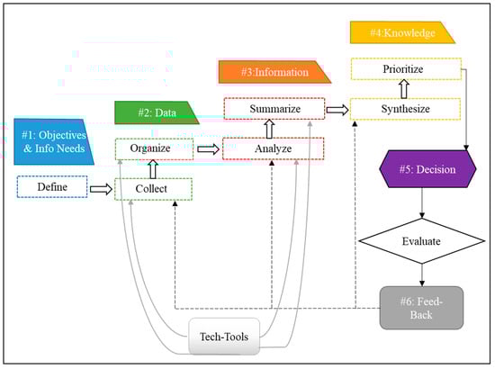 Synthesis of approaches and definition of the decision-making process: The third step involved synthesizing the identified approaches to create an efficient framework tailored to the needs of an energy organization. This framework, designed as a continuous loop, consists of six sequential steps: defining project objectives and information needs, collecting and organizing data, transforming data into information, transforming information into knowledge, making and implementing decisions, and obtaining feedback and evaluating decisions. Each step was further delineated into specific elements to ensure a comprehensive understanding of the process. Technological solutions were identified as critical enablers of this process. The synthesis of approaches built upon the strengths of existing energy sector approaches and incorporated additional elements from other fields to address any shortcomings. The details of this step are elaborated in Section 5.