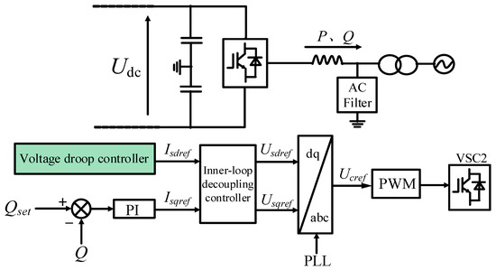 In order to address the power distribution problem among the receiving converter stations, this paper presents the voltage droop control strategy; the control system model block diagram is shown in Figure 2. The active power is influenced by the d-axis current , while the reactive power depends on the q-axis current output from the droop controller. The d-axis and q-axis currents are responsible for controlling the active and reactive power, respectively.