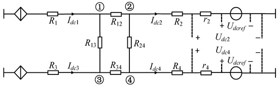 The converter stations VSC1 and VSC3 at the sending end, which have constant active power control, can be considered as current sources. The converter stations VSC2 and VSC4 at the receiving end, which have voltage droop control, can be considered as voltage sources [19,20]. Figure 5 depicts the equivalent circuit of this four-terminal flexible DC transmission system.
