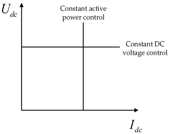 When the droop factor becomes larger, the slope of the U-I characteristic curve becomes larger, the regulation of active power becomes more sensitive, and the ability to maintain DC voltage stability becomes worse. Conversely, when the droop factor decreases, the slope of the U-I characteristic curve also becomes smaller, the ability to regulate DC voltage stability is enhanced, and the ability to regulate active power balance is weakened [21]. Essentially, the size of the droop factor determines the strength of the power regulation performance of the whole multi-terminal system. When the droop factor is zero, the U-I characteristic curve is similar to constant active power control. When the droop factor is close to infinity, the U-I characteristic curve is similar to fixed DC voltage control. Figure 6 shows the U-I characteristic curves for constant DC voltage control and constant active power control.