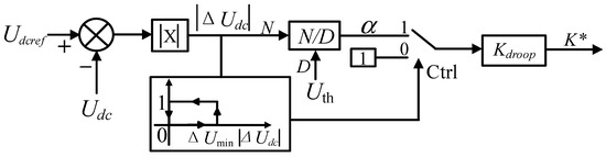 The adaptive droop controller is shown in Figure 8, and the specific process of operation is as follows: The DC voltage reference value is subtracted from the actual DC voltage value , and the DC voltage offset value is generated by taking the absolute value and comparing it with , which generates the adaptive factor shown in Equation (6). Based on the different working conditions described in Equation (9), the adjusting tendency of the adaptive factor is determined to generate the dual-input selector control signal. This control signal is then used to adjust or maintain the droop factor accordingly.