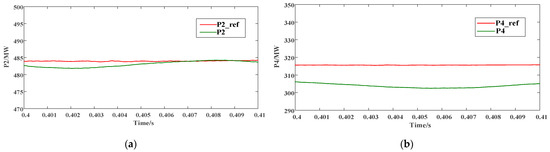 From Equation (5), VSC2 should theoretically receive an active power of 447 MW, and VSC4 should theoretically receive an active power of 353 MW, and from Figure 11, VSC2 actually receives an active power of about 446 MW, and VSC4 actually receives an active power of about 343 MW.