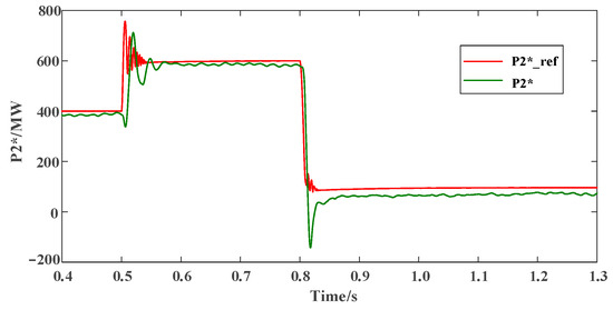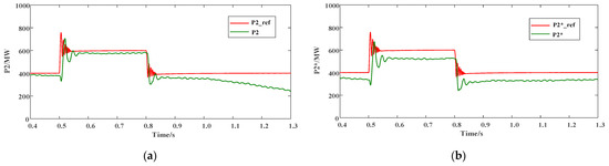 Taking the converter station VSC2 as an example, Figure 14a shows the received power waveform before improvement, represents the theoretical value of the received power, and represents the actual value of the received power before the improvement of droop control. It can be seen from Figure 14a that the droop controller loses the ability to regulate the power when there is a large power change in the converter station before the improvement, and the converter station is gradually destabilized after running for some time.