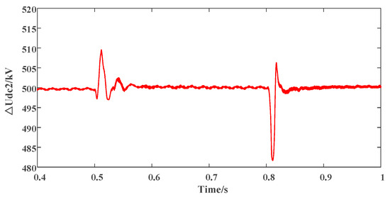 The DC reference voltages of VSC2 and VSC4 receiving converter stations, when using traditional droop control, are set at 500 kV. As shown in Figure 10, the traditional droop control has a good ability to regulate the DC bus voltage, and the DC voltage of the receiving converter station is stable at 500 kV.