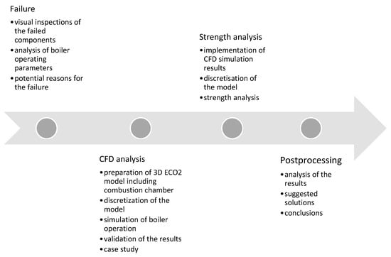 A method of modeling boiler operation based on CFD and strength analysis was developed to determine the causes of the failures in the studied boilers. The combustion process of the fuel supplied to the boiler was not modeled. In the developed method, it is necessary to know the temperature and composition of the flue gas in the combustion chamber. An extended thermal-flow analysis of a repetitive water heater section, including the preceding combustion chamber, was carried out. The radiative heat transfer process was considered using the P1 model. The investigation involved building a 3D model, discretizing it, simulating the steady-state operation of the heat exchanger just before failure, and comparing the simulation results with measured data. The results from the CFD analysis were imported into the strength analysis. The pipe could bend and expand in the developed model. For the strength analysis, a discrete pipe model was created and loaded with stresses from temperature and pressure. The thermal-flow study considered the case in which a thin vapor layer was modeled on the inner surface of the water heater pipe wall. Another issue was modeling an exchanger with smooth pipes in the first two rows. The results formed the basis for proposing an optimal solution. The thermal-flow analysis of a repeatable section of the boiler enabled an understanding of the causes of the characteristic cracking of tubes in the first rows of the second-stage water heater. The individual stages of the conducted research are shown in Figure 1.