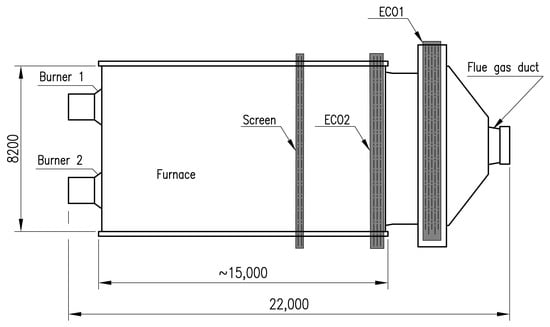 The boiler layout. The primary material applied for the construction of the heating surfaces is P235GH steel. This includes the combustion chamber, screen, ECO2, and economizer 1 (ECO1) pipes. The sequence of the heating surfaces along the direction of the flue gas flow is as follows: festoon, ECO2, and ECO1. In the combustion chamber and the festoon (up to the first rows of ECO2), radiation plays a significant role in the heat transfer process. ECO2 is composed of finned tubes, which has an impact on the amount of heat transferred and the exchange efficiency. The hypothesis is that the predominant cause of tube damage in the first row of the second-stage water heater (ECO2) was an excessively high heat flow rate absorbed by the fins and tubes on the flue gas inflow side, both at high and low loads. The described design of ECO2 has the potential to generate regions prone to failure due to surpassing the material’s temperature limits.