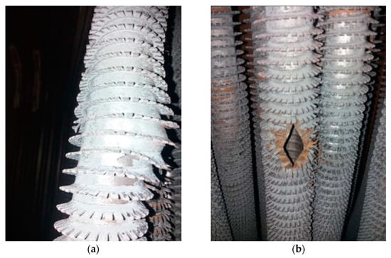 A visual inspection of the boiler and damaged components was carried out as part of the performed work. The operating parameters were analyzed just before the failure and at the time of the loss. Next, potential causes of the resulting failure were identified and investigated. It was assumed that the main reason for the damage caused was the excessive heat flow rate absorbed by the finned tubes located in the first rows of the economizer at the inlet side of the flue gas [1]. The geometry of the heat exchanger prevented analytical analysis. The heater comprises six adjustable rows of finned tubes. The fin spacing changes every two rows of tubes, which introduces additional complexity. Modeling the operation of heat exchangers of this design is very difficult, and there are no boiler models in the available literature that consider helically finned economizer tubes.