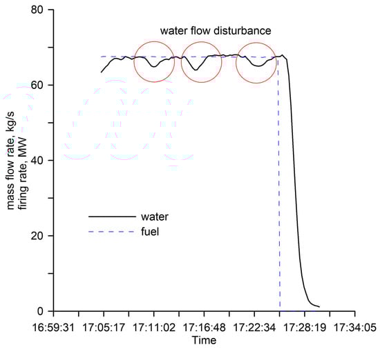 During boiler operation, selected boiler operating parameters were transmitted to the data acquisition system. Analyzing the boiler water flow rate measurements was the first step in identifying the possible causes of boiler failure. Figure 4 illustrates the disturbance in the water flow behind ECO2, which occurred just before the boiler failure. Due to a pipe burst, the safety control system shut down the boiler by cutting off the fuel supply. The failure took place at the minimum boiler load. Providing a definite explanation for this phenomenon is not straightforward. The most likely scenario involved the formation of film boiling at the tube’s wall, coupled with a rapid change in the density of the heated water flowing through the line. The emergence of evaporation would lead to an increase in flow resistance. It is important to highlight that the water flow in ECO2 is directed out from the top to the bottom of the heat exchanger. The lower water density in the lower parts of the heater hinders the flow. Furthermore, the occurrence of gases emitted from the water when increasing the temperature of the water in the heating system and the boiler (if they occur) would further strengthen the process of water flow inhibition. This might even result in a complete stoppage of water mass flow [1].