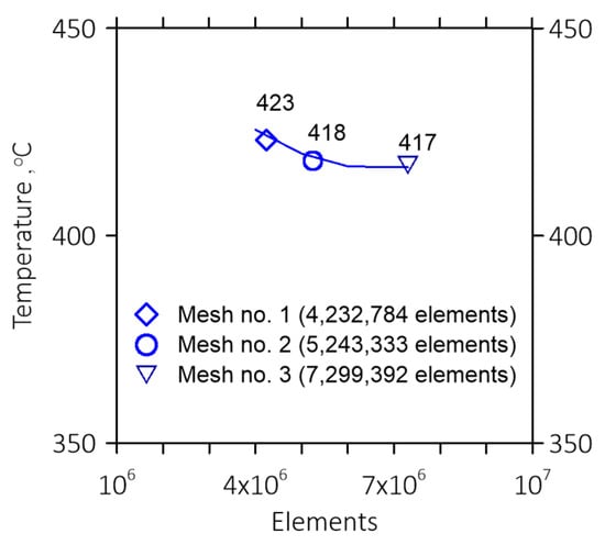 Each section comprises two staggered rows of finned pipes, with 48 pipes in each row. The combustion chamber is situated behind the burners and in front of the ECO2, and it was fully incorporated into the 3D model. The subsequent phase of the research involved creating an appropriate mesh. The relevant boundary layer was established, with the dimensionless parameter ‘y+’ equating to one [33]. Discretization is imperative due to the significant impact of discretization errors on the simulation outcomes. Prior to the investigation, a grid independence study was conducted. The mesh independence test demonstrated that a higher number of elements does not notably affect the simulation results. With 7,299,392 elements, the alteration in the relative flue gas bulk temperature behind ECO2 is less than 0.5%, as depicted in Figure 6. Table 1 outlines the quality of the finite elements. All mesh criteria were satisfied, with no more than 1% of poor-quality elements. The chosen discrete model was validated for subsequent research. The flue gas temperature in the combustion chamber was 986 °C. The simulation results, including the flue gas temperature after the water heater, and the water temperature at the outlet of the water heater, aligned with the boiler’s operating parameters. These simulations were compared with data from the boiler’s data acquisition system, prior to the failure. The following boundary conditions were assumed in the modeling. At the inlet to the combustion chamber, the mass flow rate of the flue gas resulting from the fuel fed for combustion was determined. The flue gas had a specified composition, and its temperature was derived from data recorded by the acquisition system. In the case of water inlet boundary condition, a mass flow rate was set. This was derived from the amount of water flowing through the entire exchanger.