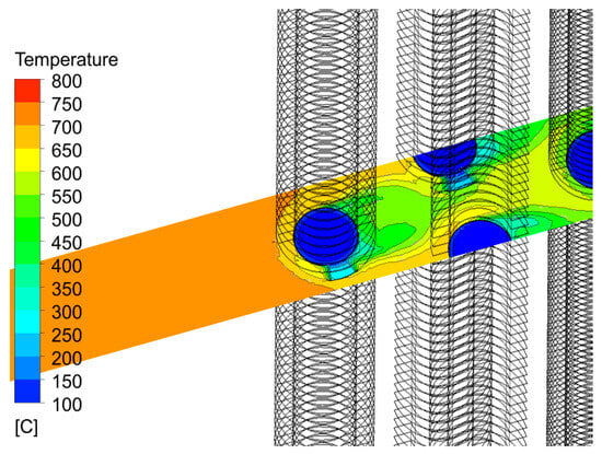 As part of the carried-out CFD simulations, the distribution of heat flux density on the inner surface of the pipe on the inlet side of the flue gas was determined. The maximum heat flux density values on the pipe’s inner surface were observed under the fin: 542,700 W/m2, and the minimum, between the fins: 396,300 W/m2. Both values are very high. It is expected that the film boiling of water (a Type I boiling crisis) will occur on the pipe’s inner surface on the inlet side of the flue gas. If the temperature difference between the wall and the water is small, the boiling is calm. If the difference increases, a permanent vapor membrane may form, separating the heating surface of the pipe from the boiling liquid [34]. The vapor layer was modeled around the entire circumference of the tube. The developed numerical model considered heat transfer from the flue gas through the helically finned tube and a thin layer of steam to the water. The geometric model used in the calculations encompassed a section of the economizer pipe covering one pitch of the finned pipe. On the inside of the pipe, the water flow was modeled. The water temperature at the inlet to the modeled volume was taken as the average temperature at half the length of ECO2. It’s worth adding that, due to the high water flow in the ECO2 pipes, the temperature rise of the working medium along the length of the pipe, de-pending on the boiler load, was approximately 10 K. A boundary condition of the third kind was set on the outer surface of the line and the fin. An equivalent heat transfer coefficient was determined for the flue gas, considering the finned pipe [35], and the assumed flue gas temperature was derived from CFD modeling. The heat transfer process was modeled by heat conduction only through the vapor layer. This also verified the effect of the wall metal and fin’s temperature field on the temperature of super-heated steam. The analysis of the calculation (Figure 16) shows that even a very thin vapor layer of 0.1 mm causes a sharp increase in the fin temperature by more than 200 °C.