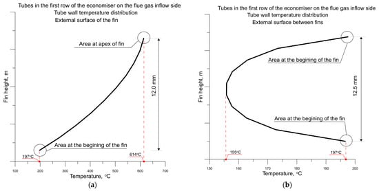 The first part of the analysis was performed for a situation in which the water mass flow inside the tubes of the second-stage economizer (ECO2) is as designed, and there is no vapor layer inside the tube at the wall on the flue gas inlet side. Performed CFD simulations show the huge effect of radiation on the operating temperatures of the first rows of tubes on the inlet side of the flue gas. Figure 7 shows temperature distribution across the first, second, and third row of the ECO2. When operating at full boiler load, the temperature at the uppermost part of the fins reaches 614 °C (Figure 8a). This temperature significantly surpasses the allowable limit for the steel used in the fins. As we move down the height of the fins, the wall temperature gradually decreases, eventually reaching 197 °C at the base. This results in a temperature drop of ΔT = 417 °C over a 12 mm section, equivalent to the height of the fins. The temperature of the outer surface of the pipe wall between the fins also peaks at the inlet side of the flue gas. The temperature change is parabolic (Figure 8b). The highest temperature on the inter-fin surface is reached at the base of the fin and is 197 °C. The lowest temperature value point is located in the middle of the fin pitch (155 °C).