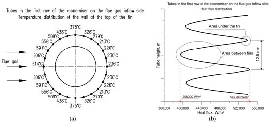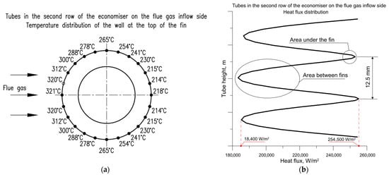 An important fact is the temperature distribution of the fin wall along its perimeter. Figure 9a shows the temperature distribution of the fin at its top (where the maximum values are reached) along the perimeter for one pitch. It can be observed that in the case of the first row counting from the inlet side of the flue gas, the temperature variation is very high. In the front part, the temperature changes of the fin wall at the top are in the range of 375 °C up to 614 °C. The rear, shielded part of the fin is operating at much lower temperatures, ranging from 226 °C to 375 °C. The temperature difference at the circumference of the fin is 388 °C. Such a high-temperature difference is the reason for high stresses in the pipe wall. High compression stresses in the fin on the inlet side of the flue gas cause high tensile stresses in the pipe wall. If the pipe is operated with a wall temperature close to the allowable temperature for the material used, this will cause very rapid failure (rupture). The maximum heat flux value on the pipe’s inner surface occurs under the fin and is 542,700 W/m2, while the lowest value appears in the center of the inter-fin space (Figure 9b). Both heat flux values are very high. It is expected that film boiling of water (Type I boiling crisis) will occur on the pipe’s inner surface on the inflow side of the flue gas. In the second row of tubes on the inflow side of the flue gas, the effect of radiation is already much more minor. According to the CFD simulation, when the boiler operates at full load, the top of the fins reaches a temperature of 321 °C (Figure 10a). Moving down the height of the fins, the wall temperature decreases, reaching 145 °C at the base. Over a 12 mm section (the height of the fins), there’s a temperature drop of ΔT = 176 °C. Additionally, on the outer surface of the tube wall between the fins, the highest temperatures are observed on the side where the flue gas flows in (Figure 10b). The warmest point on the surface between the ribs is found at the base of the fin and registers at 145 °C. The lowest temperature is recorded in the middle of the rib pitch, measuring 126 °C. Figure 11 shows the temperature and heat flux changes of the finned tube in the second row on the inflow side of the flue gas. The temperature changes are shown at the apex of the fin at the periphery (where the maximum values are reached) for one pitch. In the front part, the temperature changes of the fin wall at the apex range from 265 °C to 321 °C.