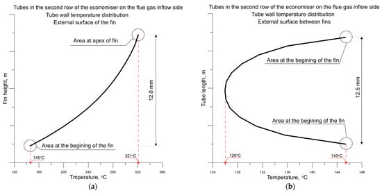 The economizer analyzed is constructed of 42.4 mm diameter helical finned tubes made of P235GH steel. The circumferential and longitudinal stresses from the pressure in the pipes can be simply determined from the analytical formulas [36]. In the case analyzed, for smooth pipes (without the fins), the stresses from pressure are negligible. For the full a boiler load, the pressure that prevails inside the water heater pipes is 1.6 MPa. The longitudinal and circumferential stresses from pressure only are 6.06 and 12.12 MPa, respectively. The stresses from the temperature, even though they will be higher, will still be less than the permissible ones. In the case of ECO2 finned pipes, determining stresses by analytical methods is difficult. Nevertheless, it can be said that the stresses from temperature and pressure will be much higher. This is due to the high temperature of the fins near their tops. There will be compressive stresses near the top of the fin, which will result in high tensile stresses in colder areas such as the base of the fin and in the pipe wall. Based on the thermal-flow calculation, and the information on the pressure that exists in the water heater pipes, a strength analysis was carried out for the first row of ECO2 pipes. The uneven temperature distribution around the finned pipe’s circumference significantly influences the distribution of longitudinal and circumferential stresses across the pipe wall, both under the fin (Figure 17) and between the fins (Figure 18). The total distribution of longitudinal, circumferential, and HMH stresses on the internal surface along the pipe on the inflow side is illustrated in Figure 19. The stress distribution is shown on two fin pitches. However, the strength analysis included a much longer length of the pipe, which could bend and extend at the ends. Tensile stresses reach 234.9 MPa. HMH stresses on the inner surface of the pipe under the fin reach a value of 283.9 MPa. Moreover, the highest stresses were observed at the top of the fin, on the side with the highest temperatures. The high operating temperature of the first row of pipes indicates its destruction due to the exceeding of the maximum permissible temperature at which the steel used may operate [37]. This results in unequal temperature distribution, whereby the stresses to which the first row of pipes is subjected exceed the yield strength of P235GH steel as early as 50 °C (Table 3).