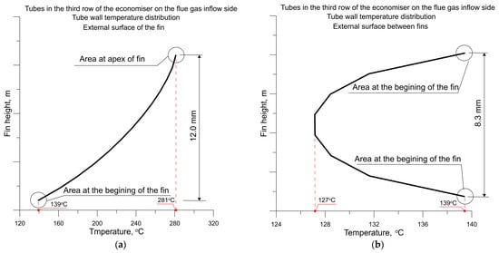 Temperature distribution for the third row of ECO2 tubes at the inlet side of the flue gas: (a) on the fin surface, (b) on the surface between the fins.
