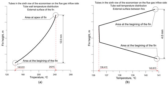 In the third row of pipes, counting from the flue gas inflow side, the effect of radiation is negligible. Therefore, a smaller fin pitch was applied, s = 8.3 mm. Operating at 100% boiler load, the uppermost portions of the fins achieve a temperature of 281 °C (Figure 12a). As we traverse down the height of the ribs, the wall temperature steadily diminishes, ultimately registering 139 °C at the base. Over a 12 mm section, equivalent to the height of the ribs, there’s a temperature drop of ΔT = 142 °C. Notably, the outer surface of the pipe wall between the fins reaches its peak temperatures at the inlet side of the flue gas. The temperature variation follows a parabolic pattern (see Figure 12b).