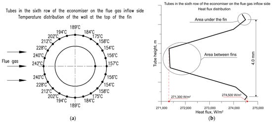 The rear section of the fin, which is shielded from direct exposure, operates at comparatively lower temperatures, typically ranging between 214 °C and 265 °C. This results in a temperature difference of 107 °C around the perimeter of the fin (see Figure 11a). Notably, tubes in the second row, starting from the side where flue gas enters, benefit from more favourable operating conditions. These tubes are obscured by the first row of tubes, significantly reducing the impact of radiation. Importantly, the maximum temperature reached on both the pipe wall and the fin remains within a safe range, below the permitted temperature for the materials they are constructed from. Regarding heat flux, the maximum value at the pipe’s inner surface occurs beneath the fin and amounts to 254,500 W/m2, while the lowest value is located at the center of the space between the ribs, measuring 184,000 W/m2 (as depicted in Figure 11b). These values are more than twice as small as those for first-row tubes, owing to the minor influence of radiation on the heat transfer process.