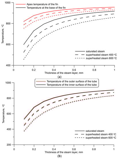 An increasing thickness of the vapor film causes a further increase in the temperature of the fin. If the vapor’s temperature increases, the fin’s temperature decreases. This is due to the rise in the thermal conductivity coefficient of superheated steam. Similar conclusions can be drawn after analyzing the results for the pipe wall. Even the thinnest layer of vapor causes a considerable temperature to increase in the pipe wall (which also depends on the amount of superheated steam).
