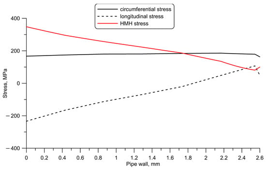 Distribution of circumferential, longitudinal, and HMH stresses along the pipe on the inner surface, on the inflow side of the flue gas (1st row ECO2).