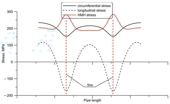 Distribution of circumferential, longitudinal, and HMH stresses on the pipe wall between the fins, at the inlet side of the flue gas (1st row ECO2).