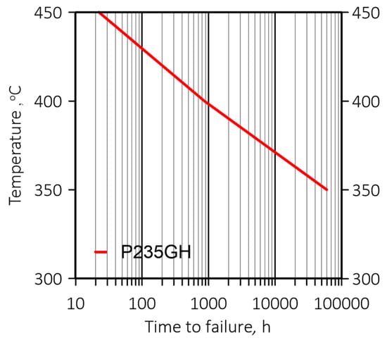 Furthermore, above an operating temperature of 380 °C, time creep strength must be considered. Table 4 illustrates the creep strength of P235GH steel for 10,000 h, 100,000 h, and 200,000 h respectively.