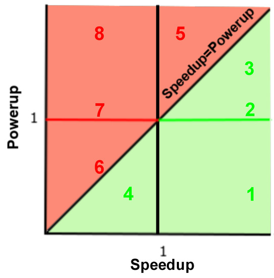 In [12], other metrics were introduced, namely: Speedup, Greenup and Powerup (GPS-UP), and code evaluation was introduced by assigning the code to one of the 8 categories depicted in the GPS-UP Software Energy Efficiency Quadrant Graph (Figure 1), where the green categories mean energy savings and the red categories mean energy loss compared to non-optimized code. The Speedup metric is known in the literature and used to analyze performance in parallel programming between different code implementations. It is assumed that we have two implementations of the algorithm, one non-optimized (basic) code running in time and the other optimized code running in time . Speedup is defined as follows:
