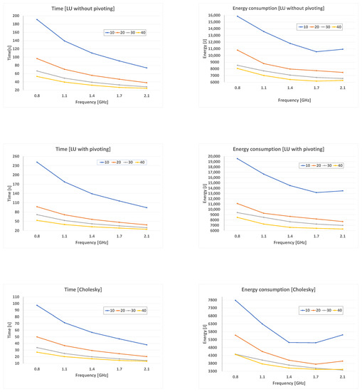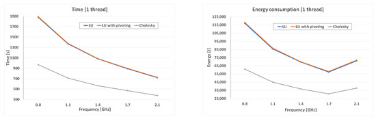 In Figure 3, we see that using clock frequency scaling down increases the runtime in all cases, while increasing the number of threads reduces it. Therefore, for our architecture, 40 threads and a frequency of 2.1 GHz were more optimal in terms of time. However, if we look at the energy consumption, in some cases, lowering the clock frequency to 1.7 GHz gave us a reduction in energy consumption. We saw this for the non-parallelized versions of the algorithms (about ), as well as for the parallelized versions in all cases for 10 threads ( for LU without pivoting, for LU with pivoting, and for Cholesky). Furthermore, for 20 threads, we noted a decrease in energy consumption at 1.7 GHz in the case of the Cholesky distribution () and even for 40 threads in the case of the non-pivoting LU factorization (). Reducing the clock frequency to 1.4 GHz and below had no benefit. Energy consumption also decreased with the increase in the number of threads used for the calculations. The only exception was the case of the Cholesky algorithm at 2.1 GHz; the algorithm turned out to have more energy savings at 30 threads compared to 40 threads. We had a similar situation here at 2.0 and 1.9 GHz (Figure 4).