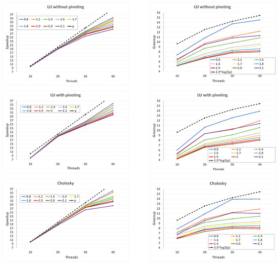 Speedup for LU without pivoting, LU with pivoting, and Cholesky (left); Greenup of LU without pivoting, LU with pivoting, and Cholesky (right) (p denotes the number of threads).