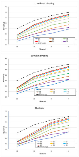 Powerup for LU without pivoting, LU with pivoting, and Cholesky for a variable number of threads (p denotes the number of threads) at a fixed clock frequency.