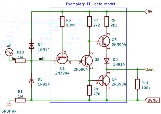In Figure 2 and Figure 3, two simulation models are presented. The first one contains the model of the uC input built with the TTL technique (https://wiki.analog.com/university/courses/electronics/electronics-lab-27, accessed on 5 August 2023). The gate has been created with the spice models of the 2N3904 transistor and the 1N914 diode.