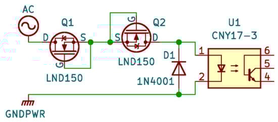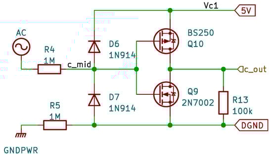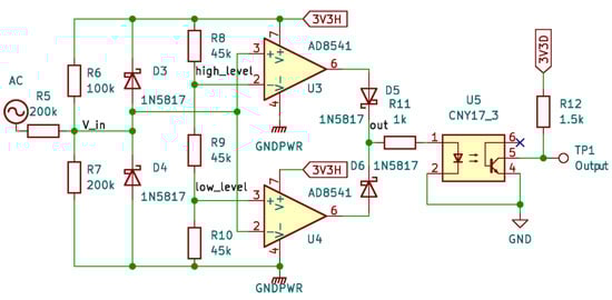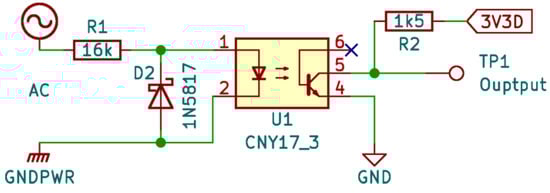 The simple idea of sensing the AC is to connect it to an input line (e.g., digital) through a resistor [11]. Furthermore, to protect the input against excessive voltage, two diodes are added, respectively, between the 3.3 V and 0 V lines (Figure 1).