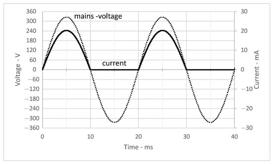 There is no need for an additional power supply, and the power dissipation by the single transistor is small: V · 2.3 mA ≈ 0.26 W. The power dissipation by the diodes, IRD, Shottky, and built-in, is in the order of milliwatts and may be neglected. The minimal reaction time of the application is equal to ≈10 s and is derived from the of the IRD (see Table 3). The transition time of the current is ≈25 s, so the reaction time of the solution is in the range (−10 s, +35 s) when the mains voltage drops and increases, respectively.