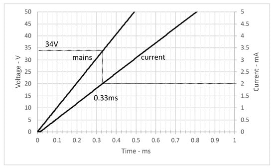 Magnification of Figure 8 in a range of 0 to 1 ms of current flowing through the resistor and IRD circuit and corresponding mains voltage. It can be observed that the recommended current is reached after 335 s at a voltage of 34 V.
