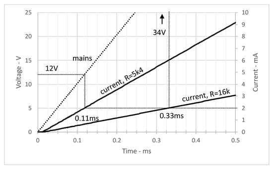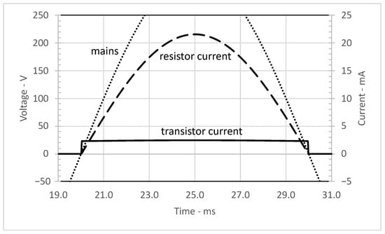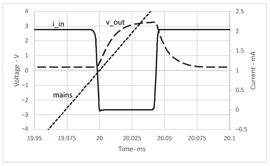 When the AC voltage drops and approaches ≈3 V, the n-MOSFET goes out of saturation ( mA) and its current starts decreasing to 0 A (see Figure 13). The current stops flowing when the mains voltage is about 1 V, which is derived from the value (see Table 3), so the signal informing about the zero crossing of the mains is made in advance, ≈10 s.