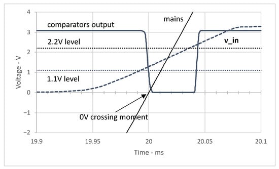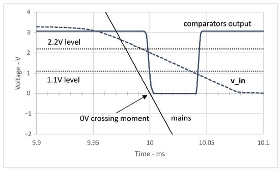 Response of the circuit with operational amplifiers (see Figure 5) at the 0 V mains crossing with negative slope (falling voltage). We can see that the comparator output drops below the 1.1 V level (indistinguishable from 0 V for the microcontroller) immediately, i.e., a few s, when the mains’ 0 V crossing occurs.
