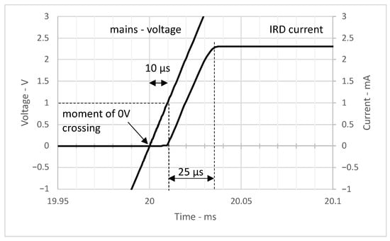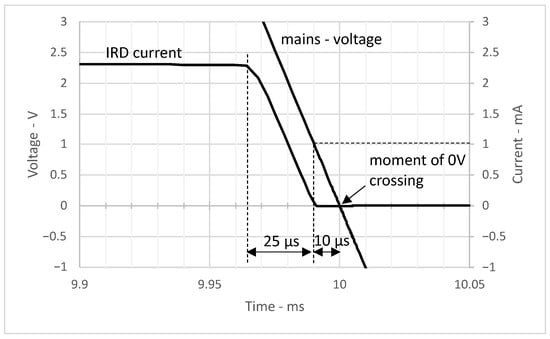 Response of the n-MOSFET depletion-type transistor circuit (Figure 6) at the 0 V mains crossing with negative slope (falling voltage). We can see that the IRD current, i.e., detection signal, drops to zero 10 s before the actual mains 0 V crossing.