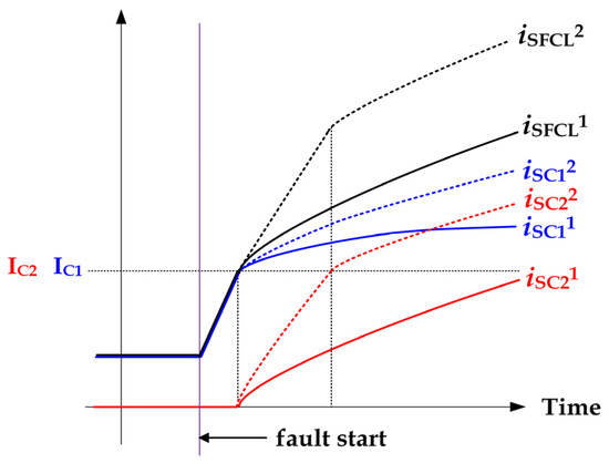Figure 2 shows the DC fault current-limiting curves of a twice-quench trigger type SFCL using a transformer according to the amplitude of the DC fault current. Two HTSC modules comprising a twice-quench trigger type SFCL using a transformer can be quenched once or twice due to whether the increased current in each HTSC module directly after DC fault occurrence exceeds each critical current (IC1, IC2) or not. The solid line and the dotted line in Figure 2 represent the lower DC fault current case (iSC11, iSC21, iSFCL1) and the larger DC fault current case (iSC12, iSC22, iSFCL2), respectively. In the case of a lower DC fault current, as indicated by the solid line in Figure 2, the DC fault current (iSFCL1) can be displayed as limited as the current in only the first HTSC module, not the second HTSC module, exceeds its critical current (IC1), i.e., the quench occurrence in the first HTSC module. However, in cases of larger DC fault current, as indicated by the dotted line in Figure 2, DC fault current (iSFCL2) can be shown to be limited as the current in the second HTSC module exceeds its critical current (IC2) shortly after the current in the first HTSC module exceeds its critical current (IC1), i.e., through twice quench occurrence in the first and second HTSC modules.