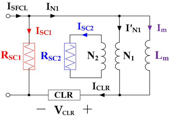 The equivalent circuit of the twice-quench trigger type SFCL using a transformer is shown in Figure 3. N1, N2, and Lm express the primary and secondary winding’s numbers of the ideal transformer and the magnetization inductance of the transformer, respectively. RSC1 and RSC1 represent the resistances of the first and second HTSC modules. The current on the primary side (iN1) of the transformer is equal to the sum of the converted current on the primary side from the secondary side (i′N1) and the current in the magnetization inductance (im). During the transient period, in the case of the quench occurrence in the first HTSC module directly after a DC fault happens, the current in the primary side (iN1) flows into both the primary winding (N1) and the magnetization inductance (Lm), as shown in Figure 3. However, in the steady state after the transient period, the current on the primary side (iN1) is expected to flow only into the magnetization inductance because the magnetization inductance is operated as the disturber for the fluctuation of the current.
