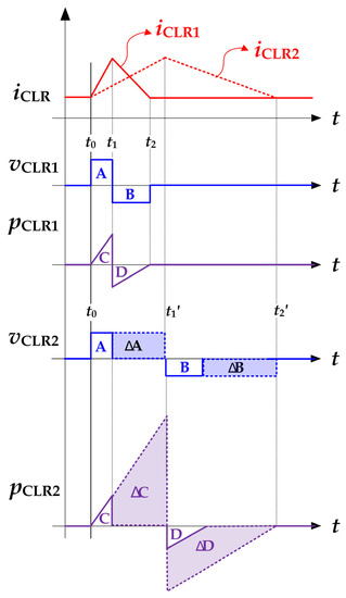 At point ‘6’, the voltage of CLR (VCLR) and the instantaneous power of CLR (PCLR), which had the negative peak value at point ‘5’, again become zero. The period from point ‘4’ to point ‘6’ can be analyzed to correspond to the discharge time of CLR. Therefore, the charge and the discharge period of CLR for one cycle can be identified as being equal to ‘0’ to ‘6’ points from Figure 6.
