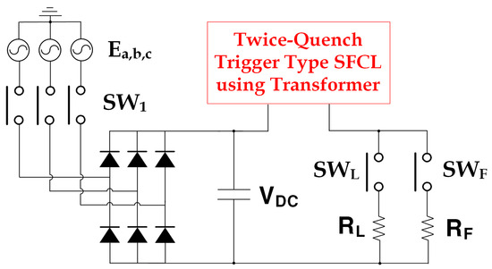 The schematic configuration of a DC fault experimental circuit to analyze the operational characteristics of a twice-quench trigger type SFCL using a transformer is shown in Figure 5. DC source voltage was obtained by rectifying three-phase AC voltage (Ea, Eb, and Ec) through a power diode bridge circuit. After SW1 is closed, SWL connected in series with RL is closed, which allows normal DC current to flow through only RL resistance. To generate DC fault current, another SWF connected in series with RF resistance is closed. If RL and RF resistances are designed to be 10 Ω and 2.5 Ω, respectively, DC fault current can be generated 5 times larger than the normal time because the equivalent resistance of RL and RF resistances with a parallel connection is 2 Ω. To simulate DC fault current for 100 [ms], SWF was closed at 0.3 [s] and opened at 0.4 [s] after SWL was closed.